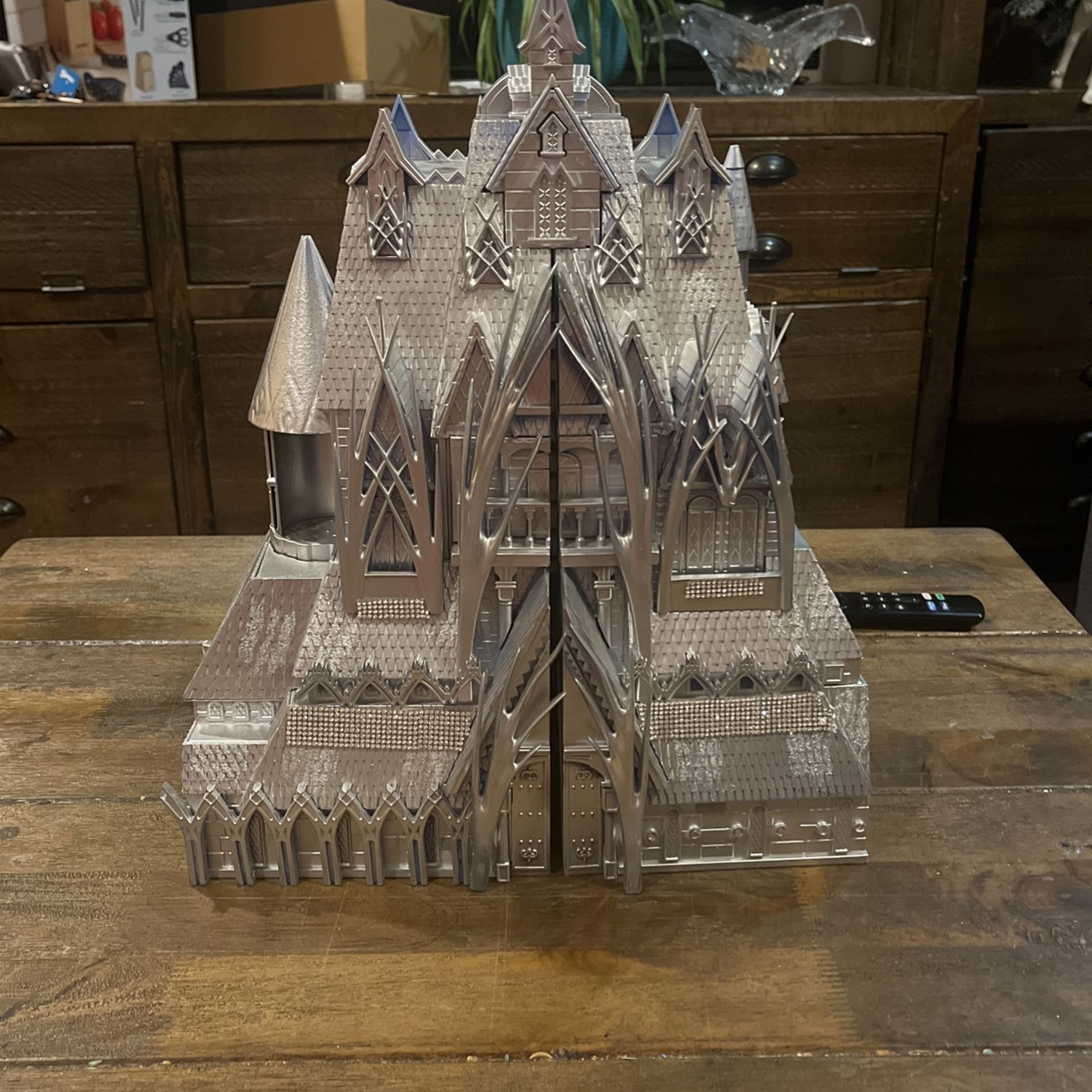 Castle opens up displaying front or back. Display items are displayed from back. Castle can be displayed open or closed. Height 161/2 Width open 26 inch , closed 131/2 Length open 4 inch Length closed 7 inches Both side are equally gorgeous, perfect for a spinner or rotating device. But not necessary or included