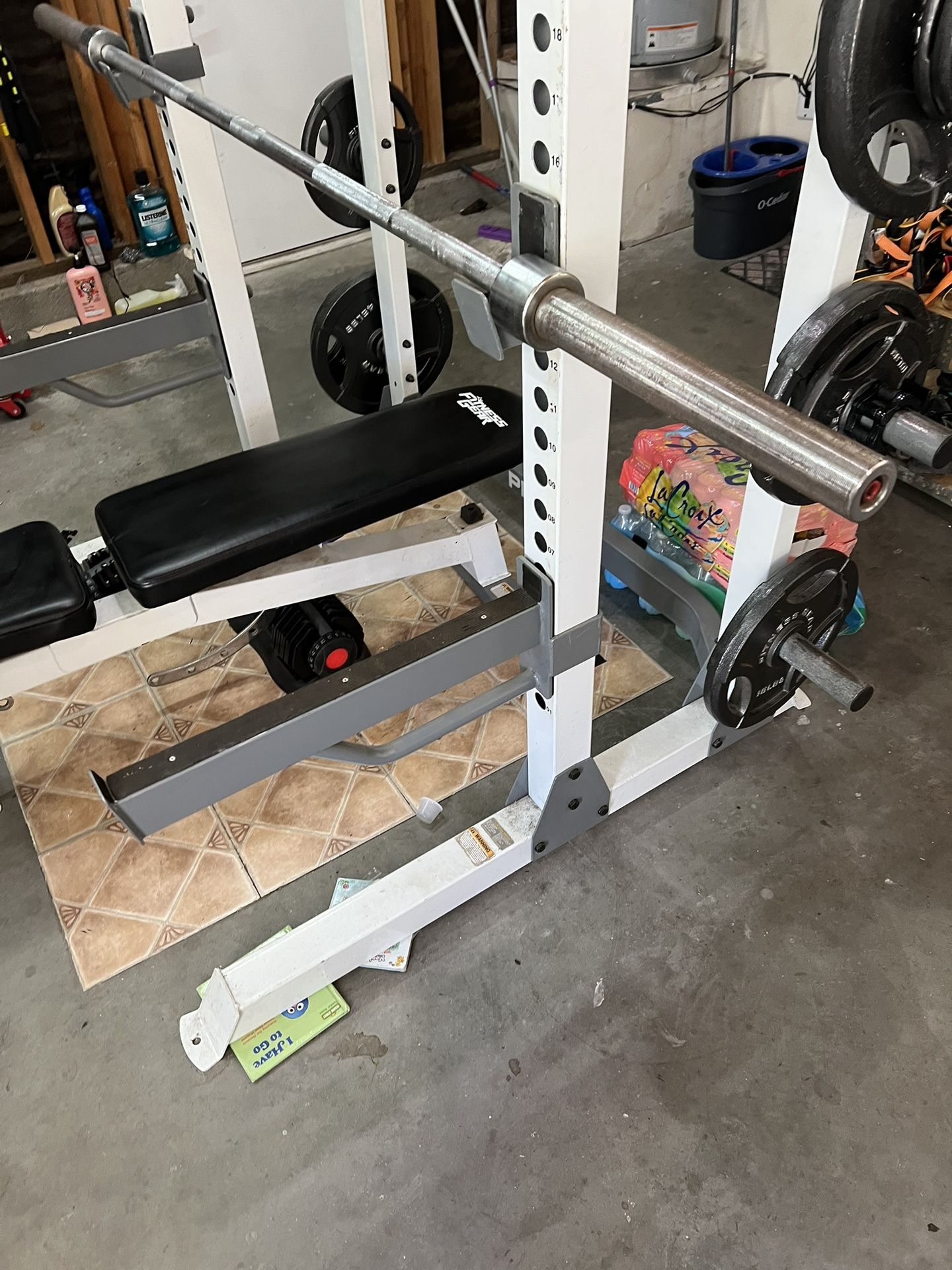 Barely used always garage kept looks like new still. Very sturdy. Does NOT include the 2 dumbbells I am keeping those. But it includes the bench, Olympic size bar and set of weights 45s 35s 25s 10s 5s 2.5s. And squat rack.
