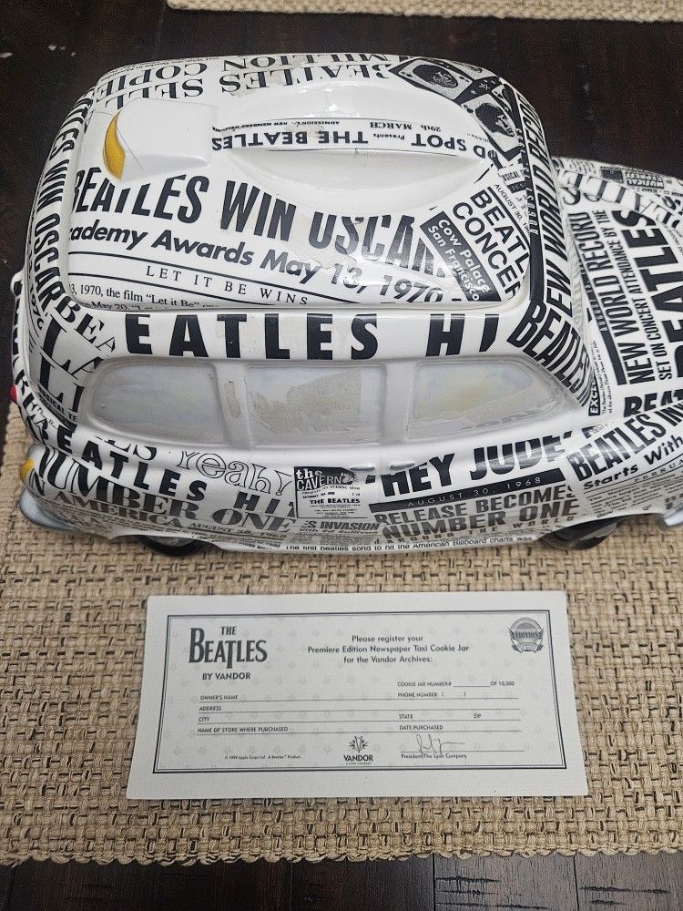 Up for sale beetles cookie jar by vendor there is a little residue on the windows nothing serious will come off