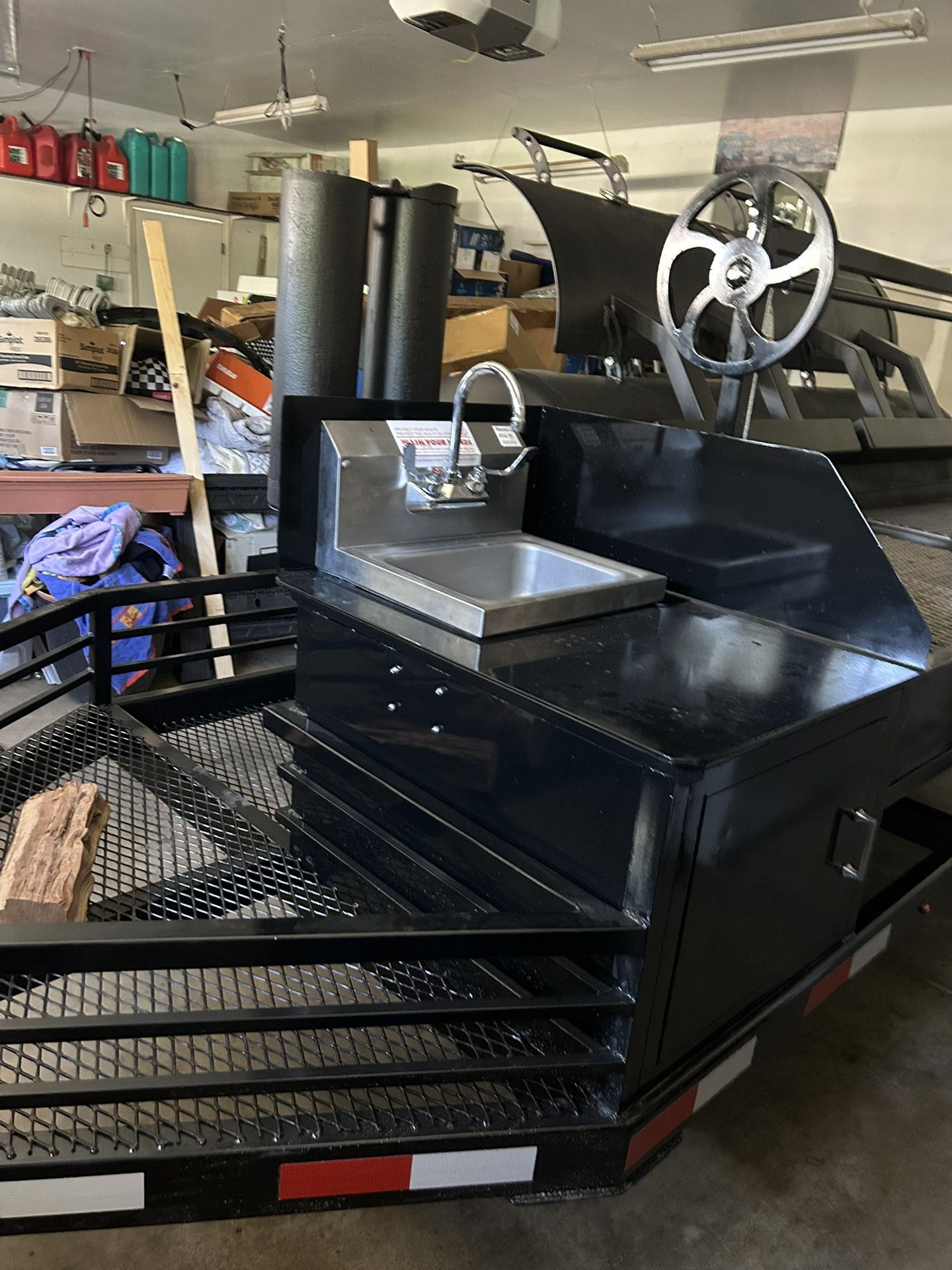 Eager to sell make an offer Santa Maria’s individually are 47 inches by 28 1/2 inches Lengthwise both put together is 97 inches 10 inches deep Inside smoker, bottom grates are 29 1/2 inches by 34 inches Top grates are 34 inches by 25 1/2inches Trailer is 17feet long Hand wash sink Wood catch Smoke stack folds Has battery for hand wash sink and the buckets Double Santa Maria’s Inside the smoker there’s a metal piece too that was added to deflect straight flame Valve on bottom to drain liquids built up