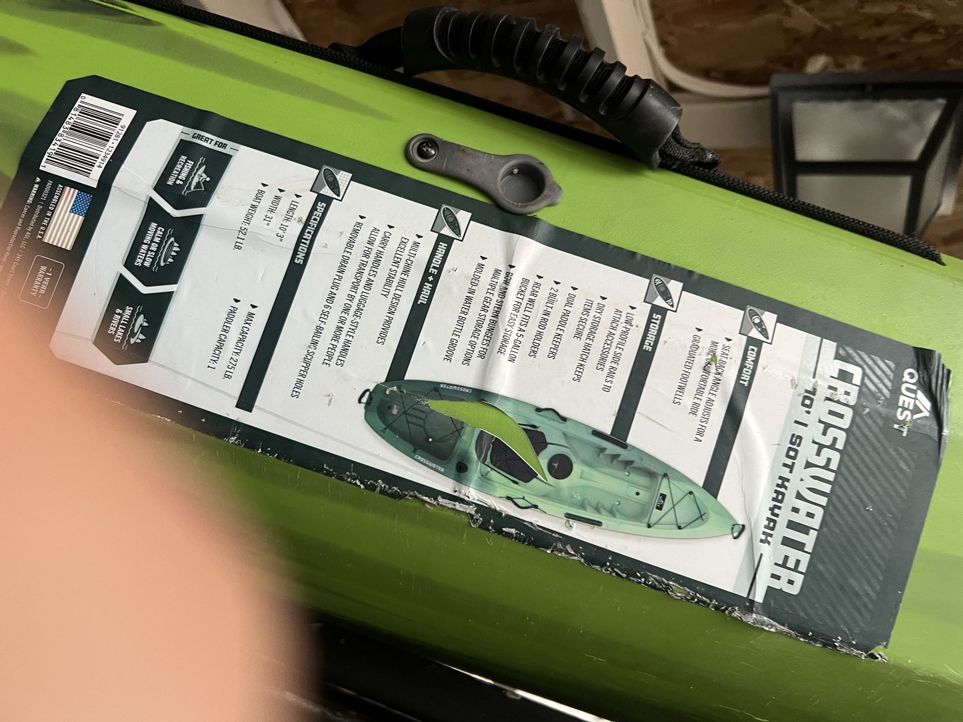 The item shown is a Quest Crosswater 100 Sit-On-Top Kayak. Length: 10' 3" Max Capacity: 275 lb Key Features: Multi-chine hull design for excellent stability, adjustable seat, dry storage hatch, and built-in rod holders. Use Case: Designed for fishing and recreation in calm or slow-moving waters, small lakes, and rivers. Portability: Equipped with bow, stern, and luggage-style handles for easy transport