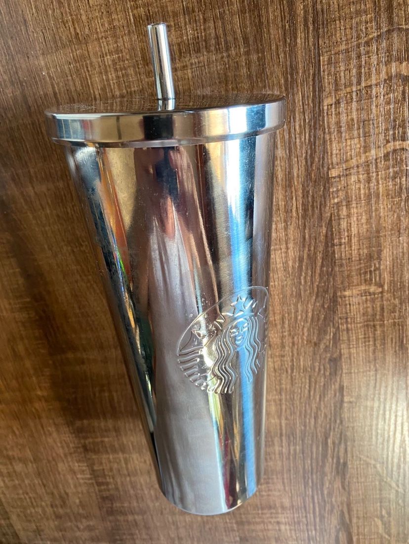 $10 STARBUCKS Brushed Stainless Steel 24 FL.Oz. Travel Mug/ Tumbler W/ Lid, straw and cleaning brush.