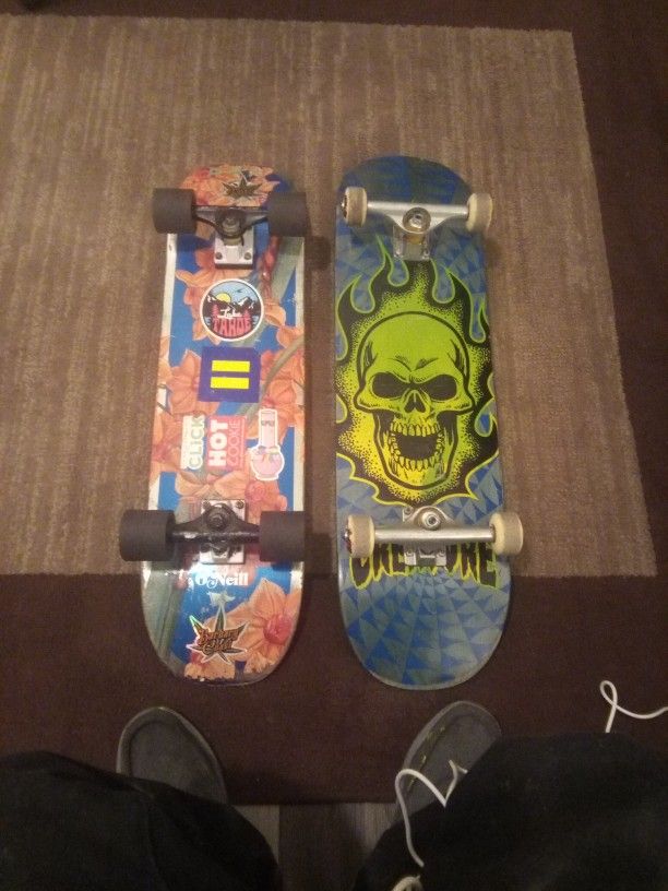 The creature has independent trucks and Decenzo STF's 52 mm wheels with Bones Super Reds for bearings and the O'Neill has Dusters 62 mm wheels and Reds for bearings and Venture trucks with spacers