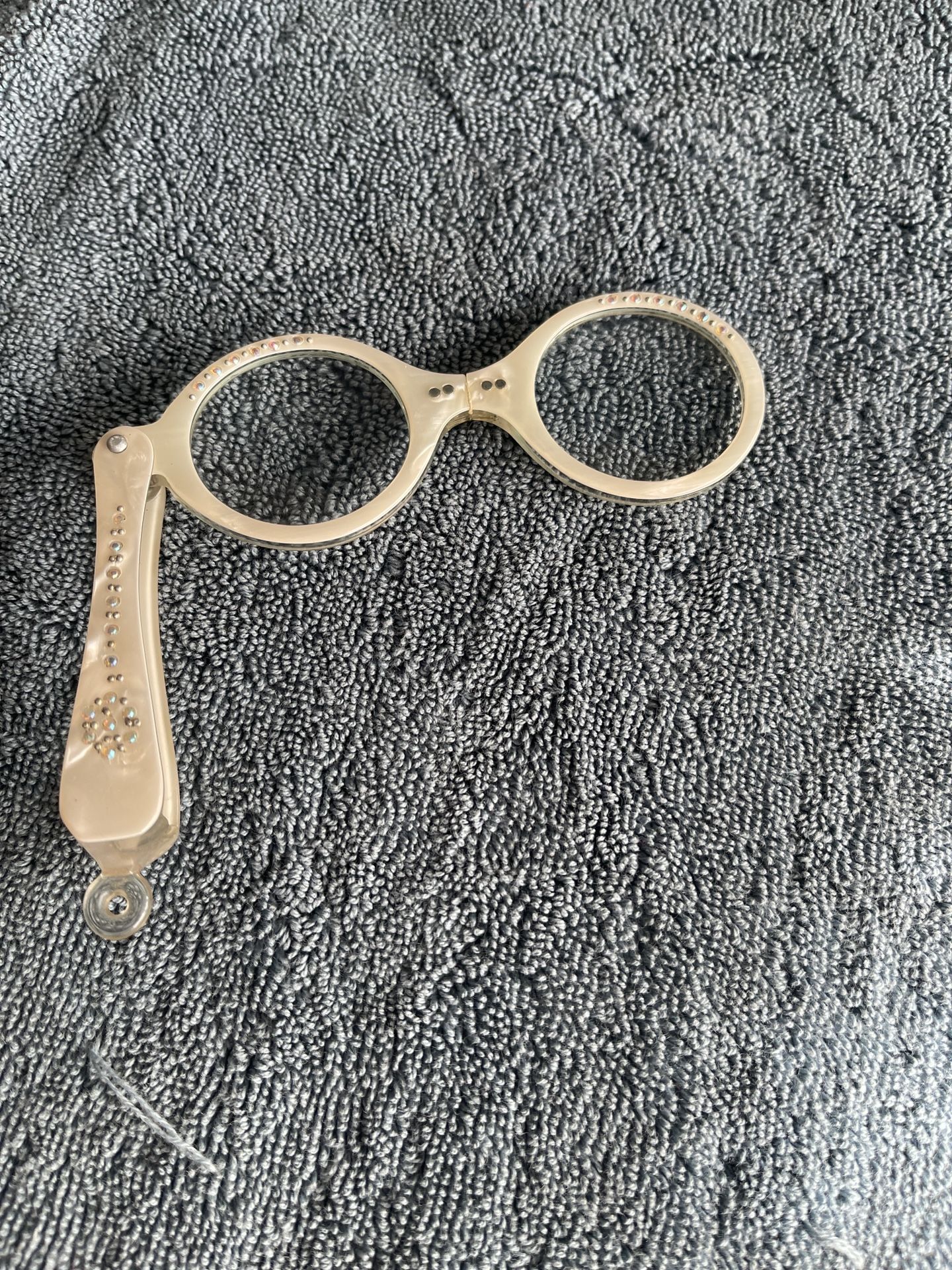These vintage folding lorgnette glasses feature a single handle and classic round frames made of translucent cream plastic, accented with small rhinestones along the rims and handle. Equipped with a central metal hinge, they fold neatly for display or storage. A striking accessory for collectors, vintage fashion styling, theater use, photo shoots, or decorative display. Very good condition, folding mechanism functions properly, rhinestones intact