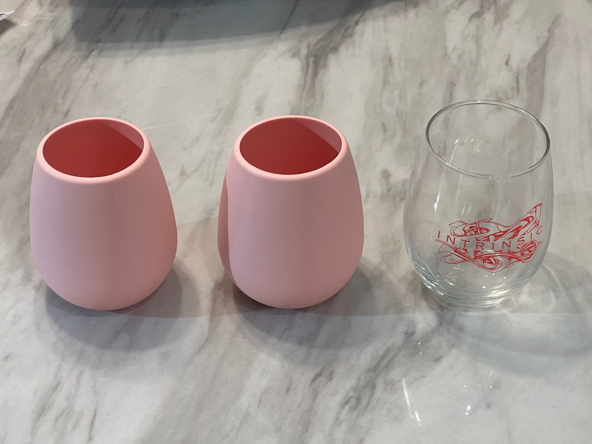 Outdoor-safe, silicone stemless wine glasses and one glass stemless. Pickup in Gilbert.
