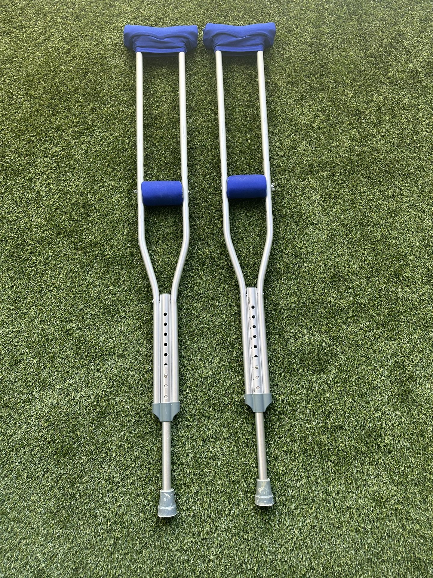 Lightweight and durable adjustable aluminum crutches in good condition. The blue underarm covers are soft and cushioned, helping reduce pressure and discomfort under the arms, making them more comfortable for daily use. • Adjustable height • Lightweight aluminum frame • Soft padded underarm covers for reduced underarm pain • Comfortable hand grips • Non-slip rubber tips • Condition: Used, clean, and fully functional