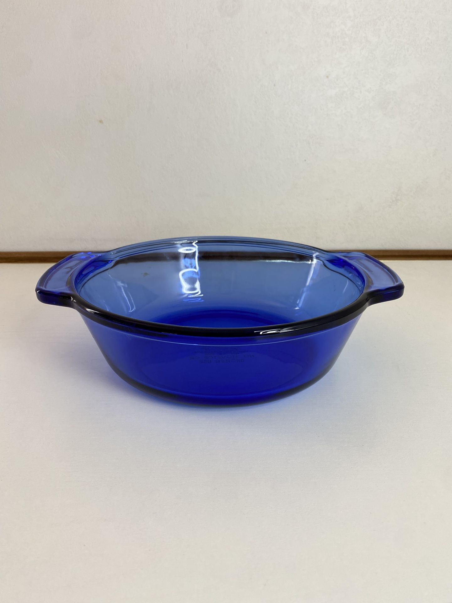 Anchor Ovenware Cobalt Blue 9-inch 2-quart Casserole. In good condition no chips or cracks, just scratches on the bottom as you can see in the pictures. See all pictures for more details