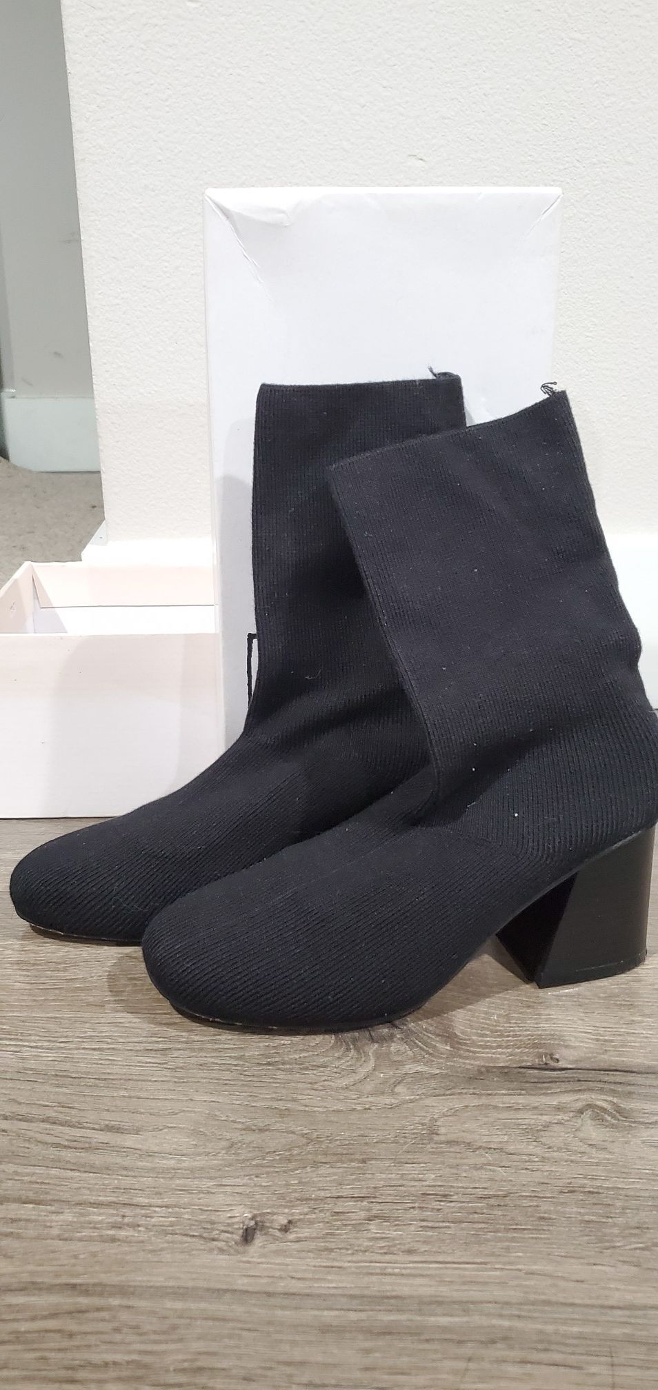 High Heels with fabric boots. Worn 2x. Size 5. Great condition. $15