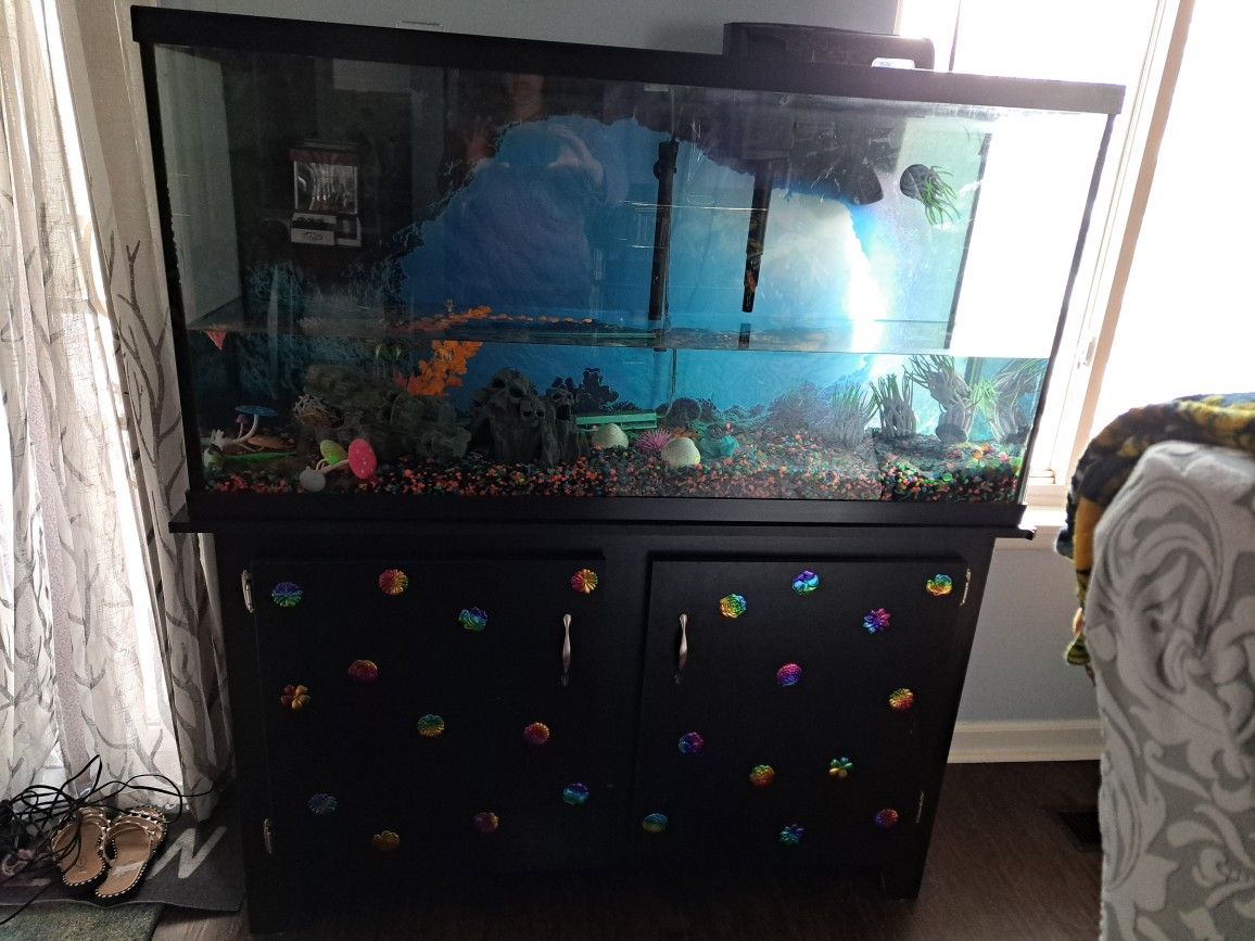 Used 55 gallon fish tank, with storage cabinet, for pick up only. Comes with working lights (white and blue), filter, heater, bubbler, and decorations if desired. Everything just needs a good cleaning. Measurements: 55" height, 48" wide, and 14 1/2" deep. Check out my other sales, which have brand new, unused, fish tank items.