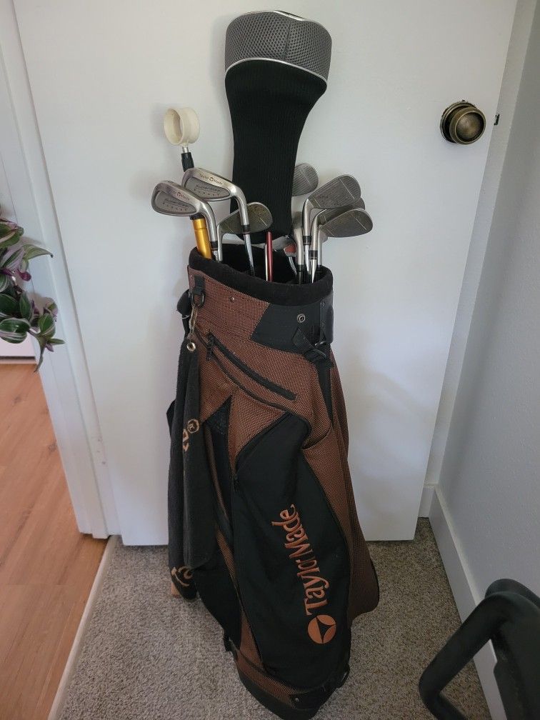 Set of golf clubs including 10 clubs, bag, and ball catcher