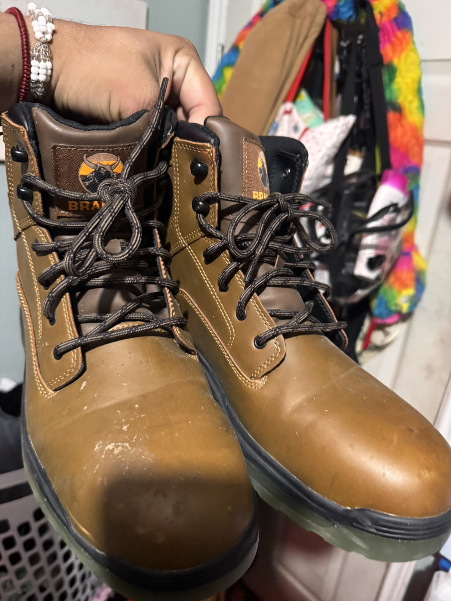 Brown boot, leather, steeltoe, size 12, used once but didn't use again. Bottom sole is a greenish but the shoes are basically new. Hablo español