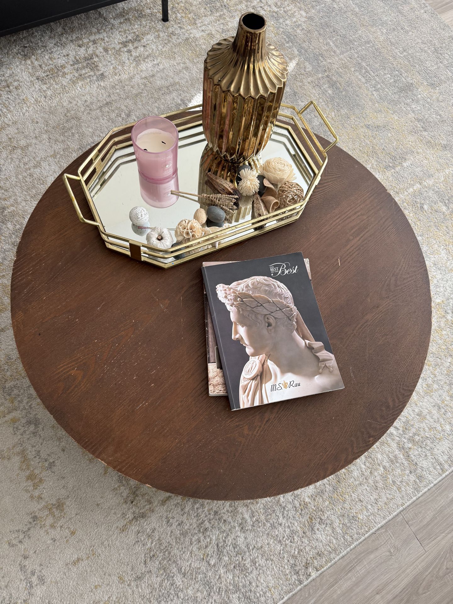 Elevate your living space with this stunning, modern round drum coffee table and curated accessory set. This low-profile table features a rich dark wood finish and a clean, minimalist silhouette that works perfectly with contemporary, mid-century, or transitional home styles. The Coffee Table: • Design: Elegant drum/pedestal shape with a smooth, spacious top. • Finish: Deep espresso/walnut wood grain. • Condition: Excellent, well-maintained with a sturdy base. • Dimensions: Diameter 32” x Height, 14” Included Accessories: • Gold Octagon Mirror Tray: A vintage-inspired geometric tray with a mirrored base, perfect for organizing remote controls or showcasing decor. • Modern Fluted Vase Set: A stylish, textured gold ceramic vase (optional faux greenery included). • "The Best of the Best" Coffee Table Book: An elegant, large-format hardcover from M.S. Rau featuring fine art and antiques—adds an instant touch of luxury. Pricing: * Complete Set: $60 (Best Value!) • Table Only: $50 • Decor Set Only: $10 Local pickup only. Item is located in Downtown Dallas.