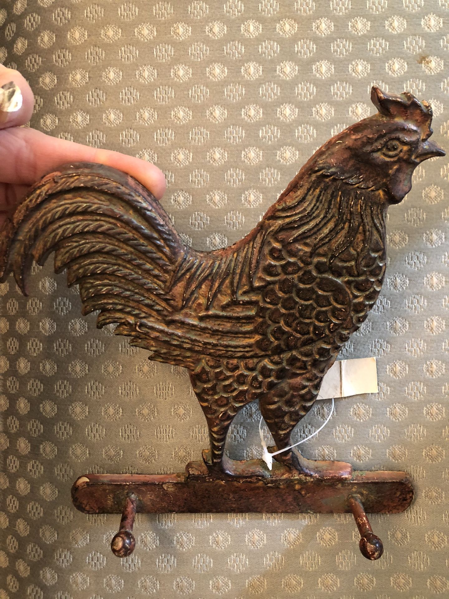 Farmhouse Rooster wall hanger This is a rare find ! Beautiful detail! Metal wall mounted hanger with bracket (on back for hanging) 2 hooks (for keys, lanyards, pet lease, etc) 8 inches tall and 7 inches tall