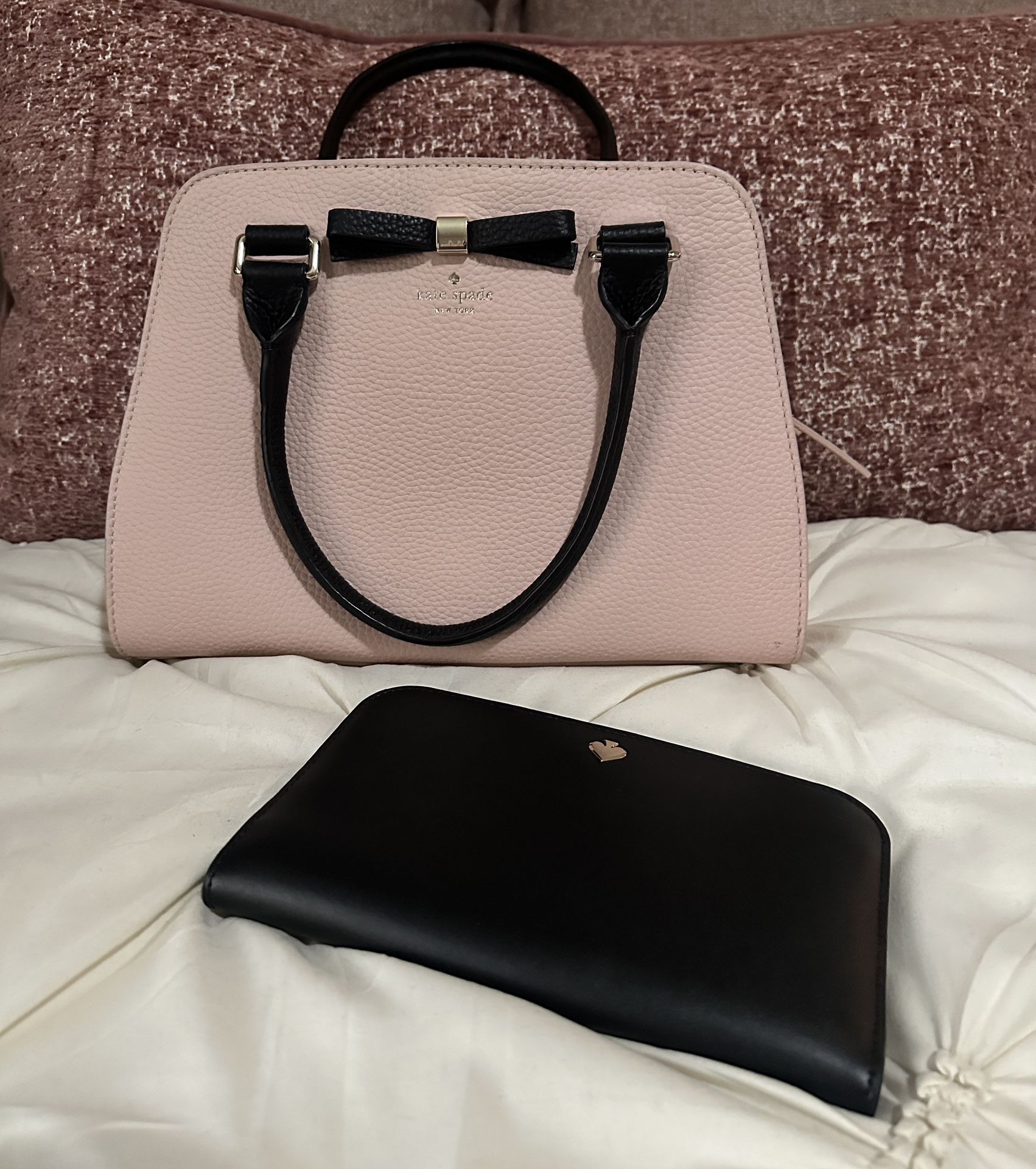 Brand new never used pink and black Kate spade purse and wallet. Long strap included.