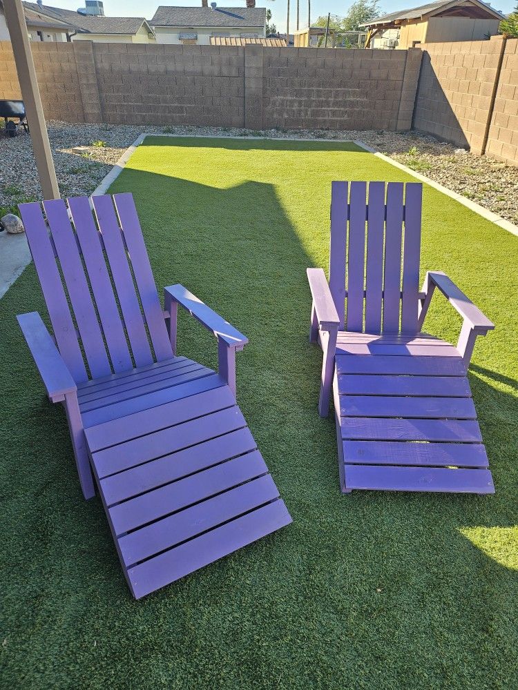 Home made Adirondack chairs made out of 2x4's and 1x4's. Real wood and they are heavy. We are moving and can't take them with us. Each has a foot stool that can be used or moved depending how you want to sit. I used purple Behr deck paint to paint them. Both are in good shape. Some slight wear and tear but overall they're solid. Asking $120 each or $200 for both. Thanks.