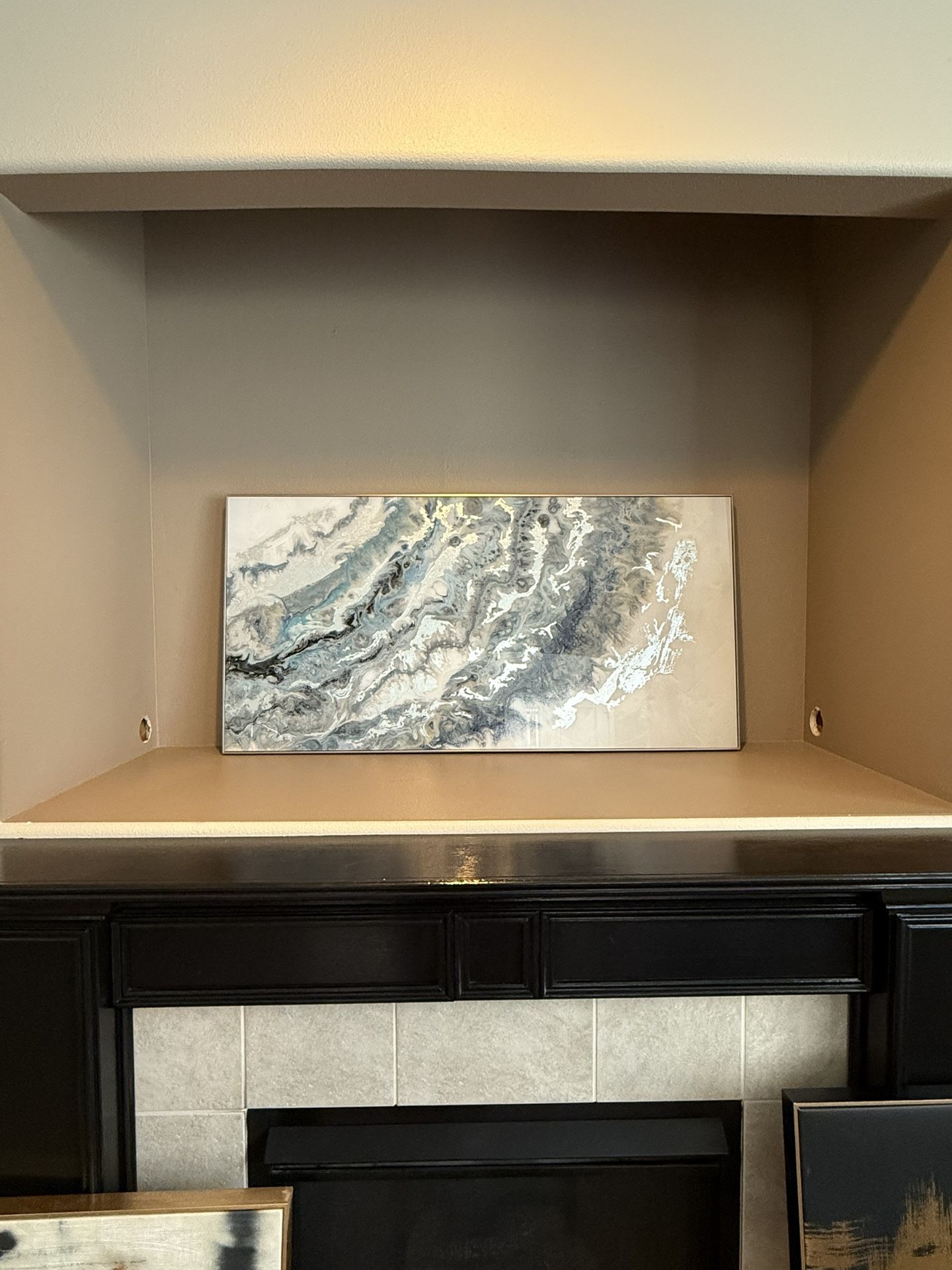 Large modern abstract canvas wall art, size 48” x 25”. Blue, gray, white, and gold marbled texture. Framed edge, lightweight, ready to hang. Good condition. Pickup only. Selling reason: moving out of state, priced for quick sale