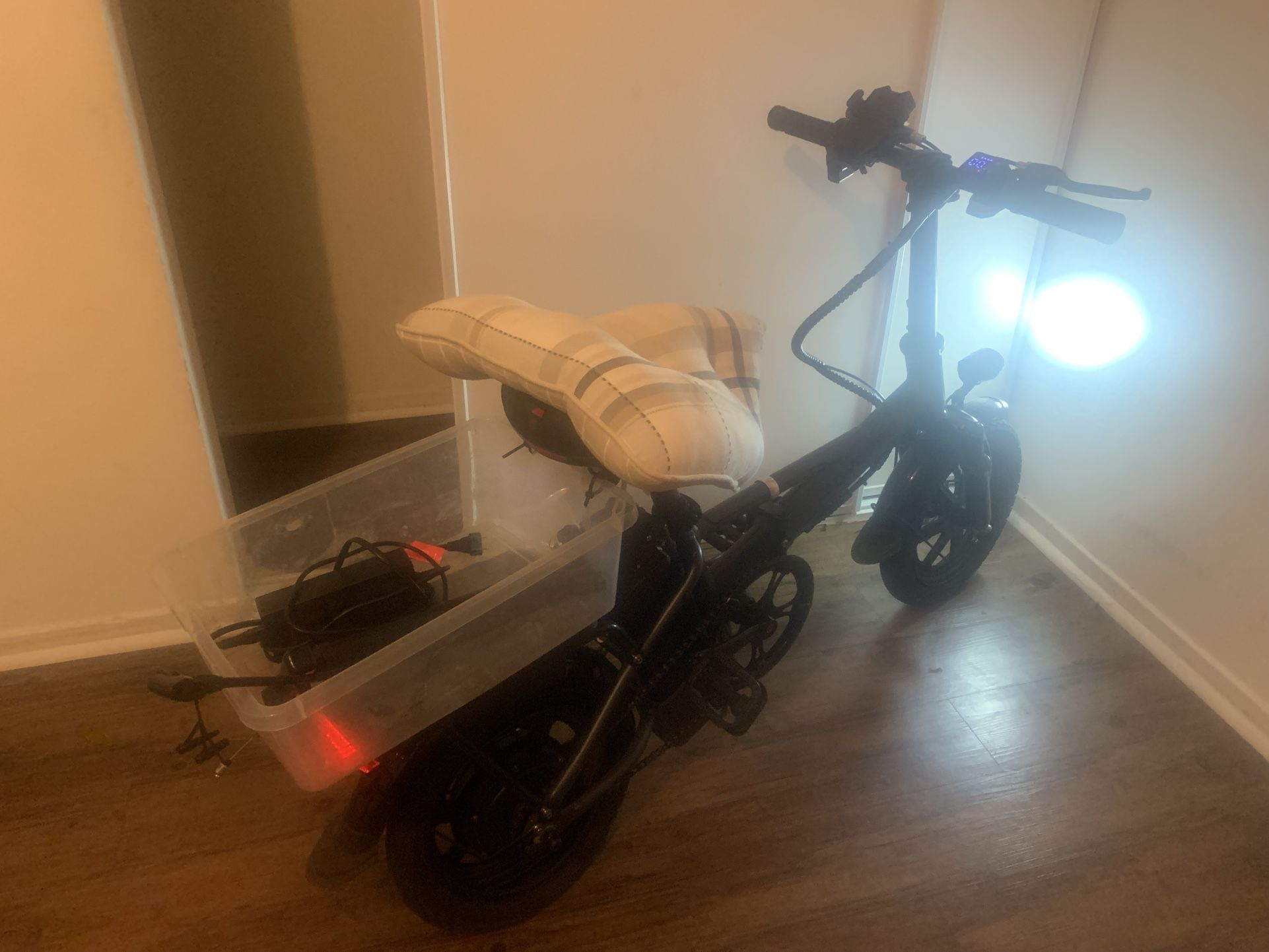 Selling AOVOPROE bike comes with bike pump and charger runs fast and strong about 15 miles an hour about 25 miles per charge needs a back tube. It is flat other than that. It’s in perfect condition 200.$