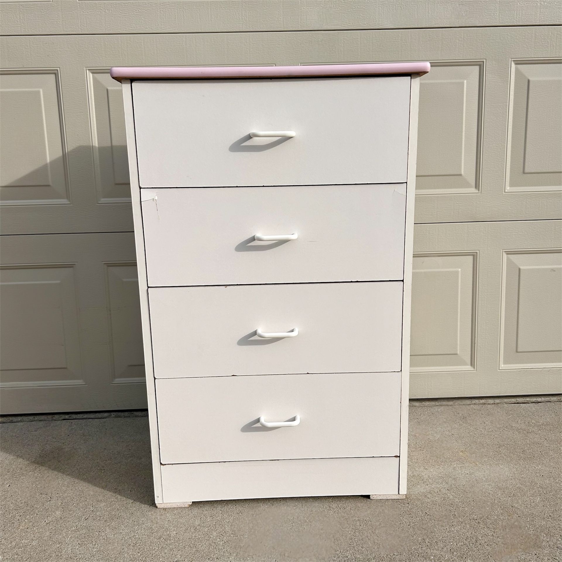 This bright white, 4-drawer dresser has a cute pink trim detail. Dimensions: W 23” x D 16.5” x H 35”. Drawers are spacious and open / close smoothly. Clean and ready to go. From a smoke and pet free home. Pick up in Elk Grove, 95757 area.