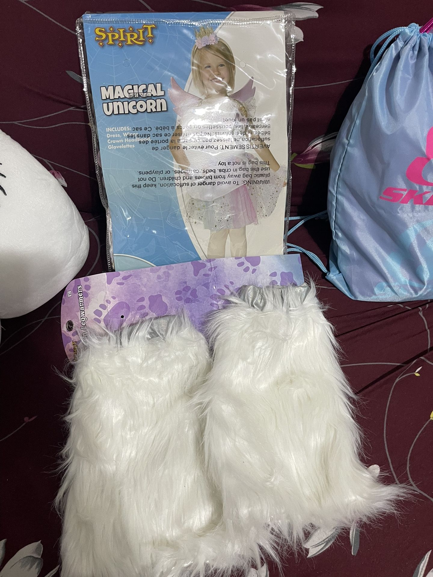 Costume plus leg warmers and a unicorn bucket for trick or treating.