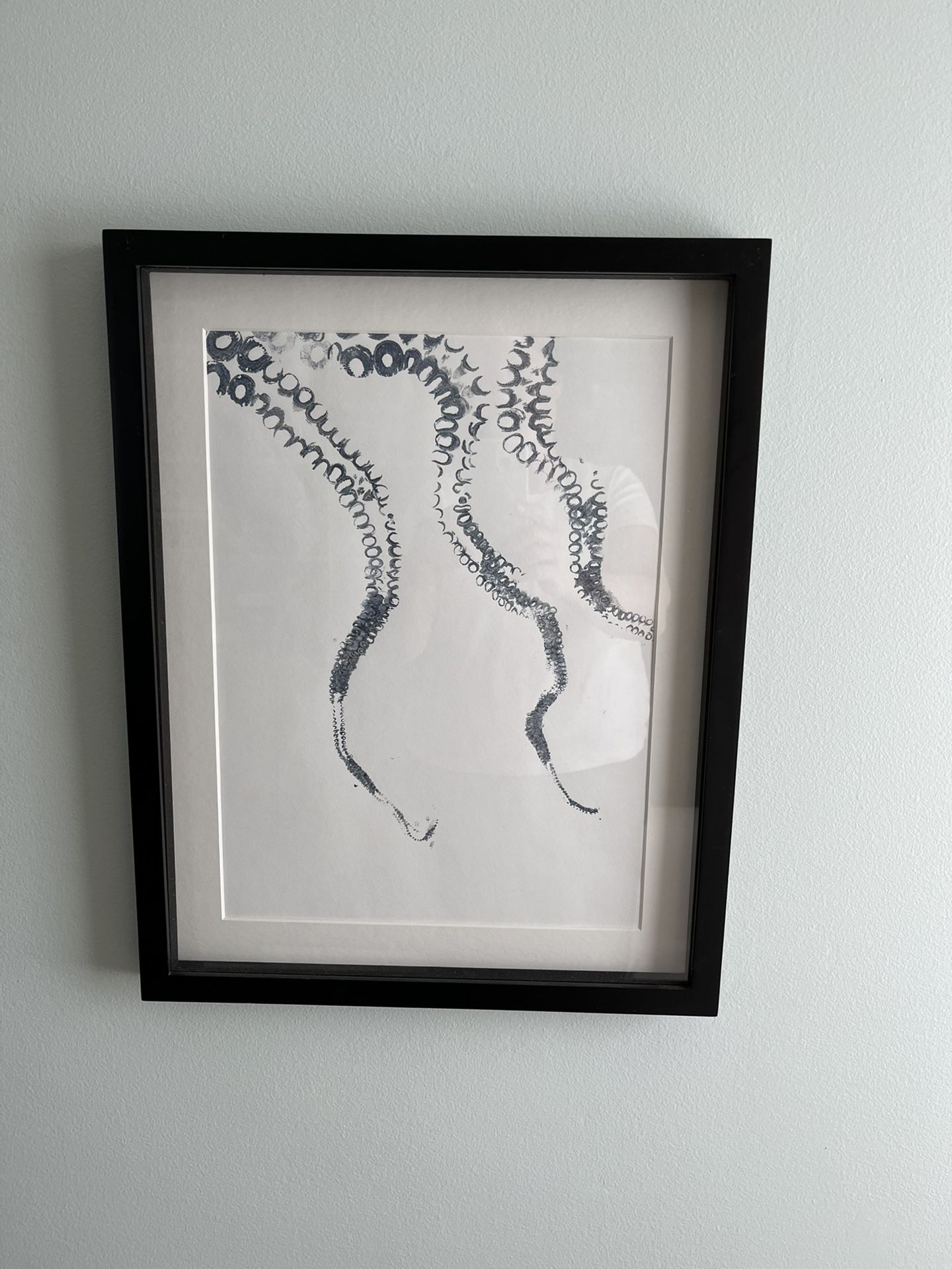Framed one Measures 19.5 X 15 overall. Original handmade art print using actual octopus with ink. Love it as is or swap out and just use frame., canvas is 12 X 12 ( can be turned any direction) Modern, coastal, sea life, nature, pottery barn, painting