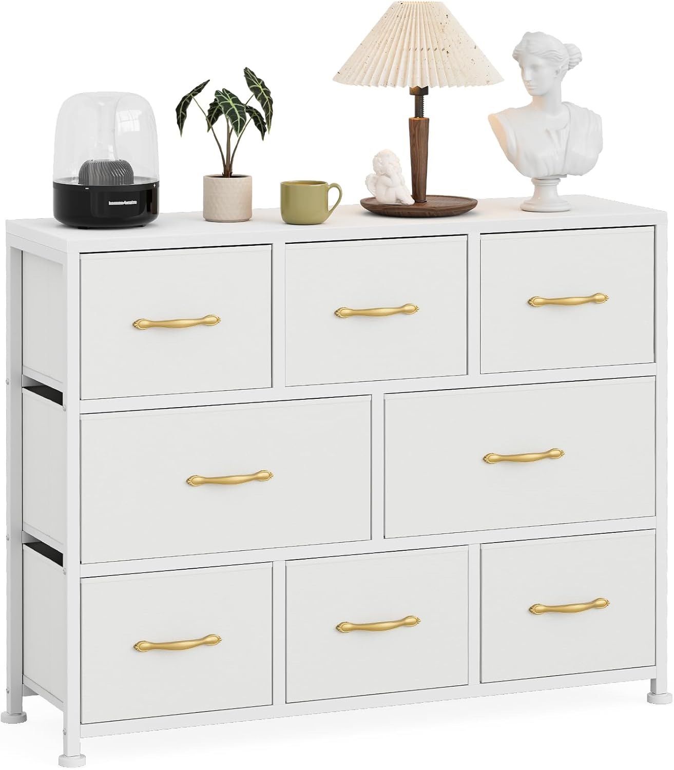 8 Drawers Dresser, Large Fabric Dressers & Chest of Drawers with Sturdy Metal Frame, Wood Top, White