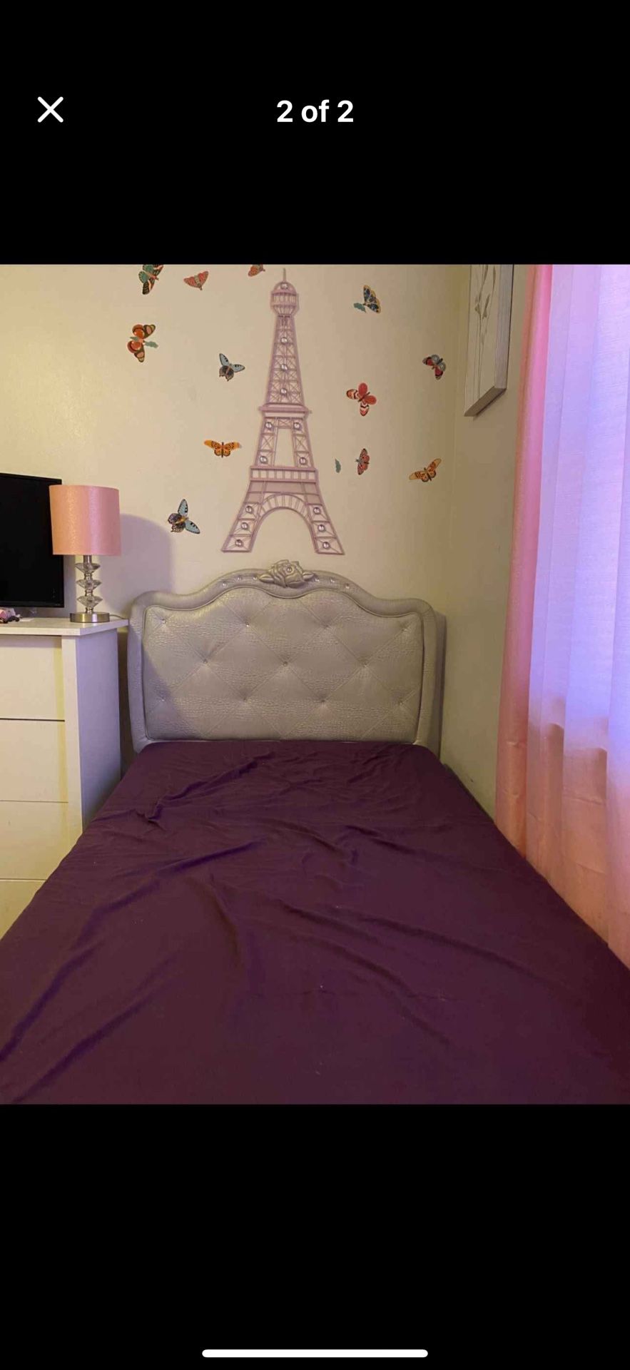Good condition Gray color Solid Sturdy Ashley brand Material: wood covered with leather like material Twin size bed frame: headboard, footboard, side boards Dresser/6 drawer All drawer in good working condition Located Westside 79922 Cash payment only Pick up Westside: 79922 Delivery available