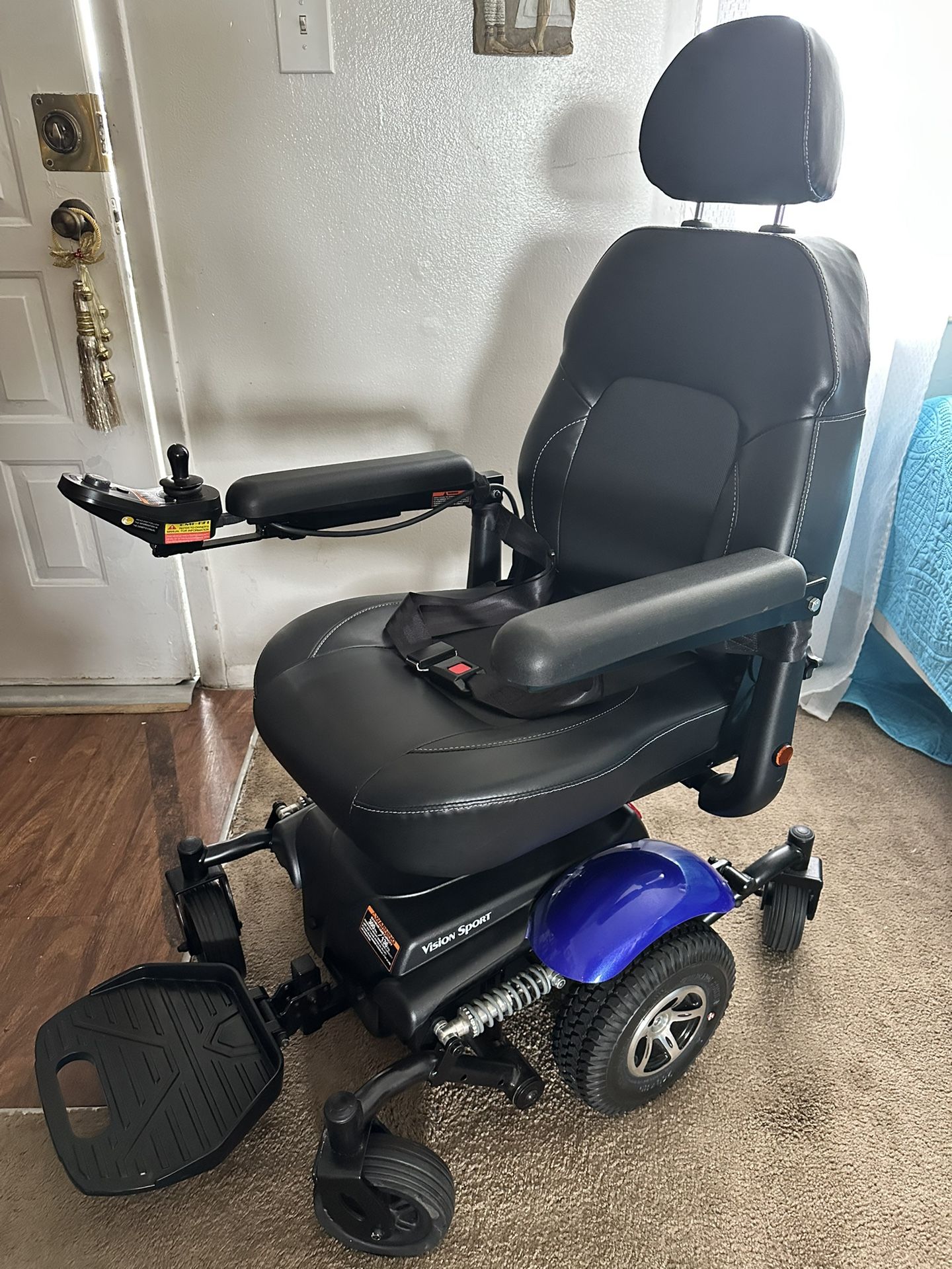 Excellent condition. Merits Vision Sport Power Wheelchair, a mobility aid for individuals with difficulty walking. Like NEW. Well-maintained. 300 lb capacity. Model P326A Non-smoking home. Includes cables to recharge battery. Impeccable condition. Must Sale it has always been stored indoors. Located off Walsingham & 137th Street Largo, FL 33770