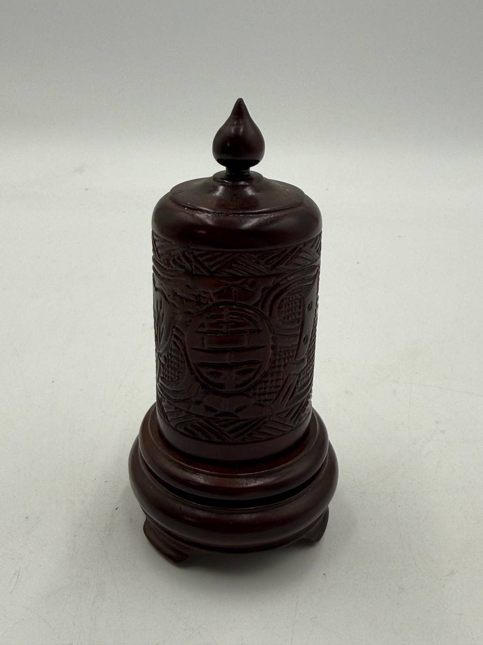 Vintage hand-carved wooden lidded jar featuring detailed Asian-inspired symbols and geometric patterns. Crafted from solid dark hardwood with a smooth finish and fitted lid topped with a finial. Details: • Material: Solid carved hardwood • Style: Asian / Chinese-inspired décor • Features: • Intricate carved symbol motif • Removable lid with pointed finial • Stepped pedestal base • Finish: Dark stained wood • Condition: Very good vintage condition; light surface wear consistent with age, no cracks or repairs noted This piece works beautifully as: • Decorative accent • Storage for small items • Shelf, altar, or tabletop décor • Asian or Zen-inspired interior design Solid, well-balanced, and nicely carved — higher quality than most modern souvenir pieces.