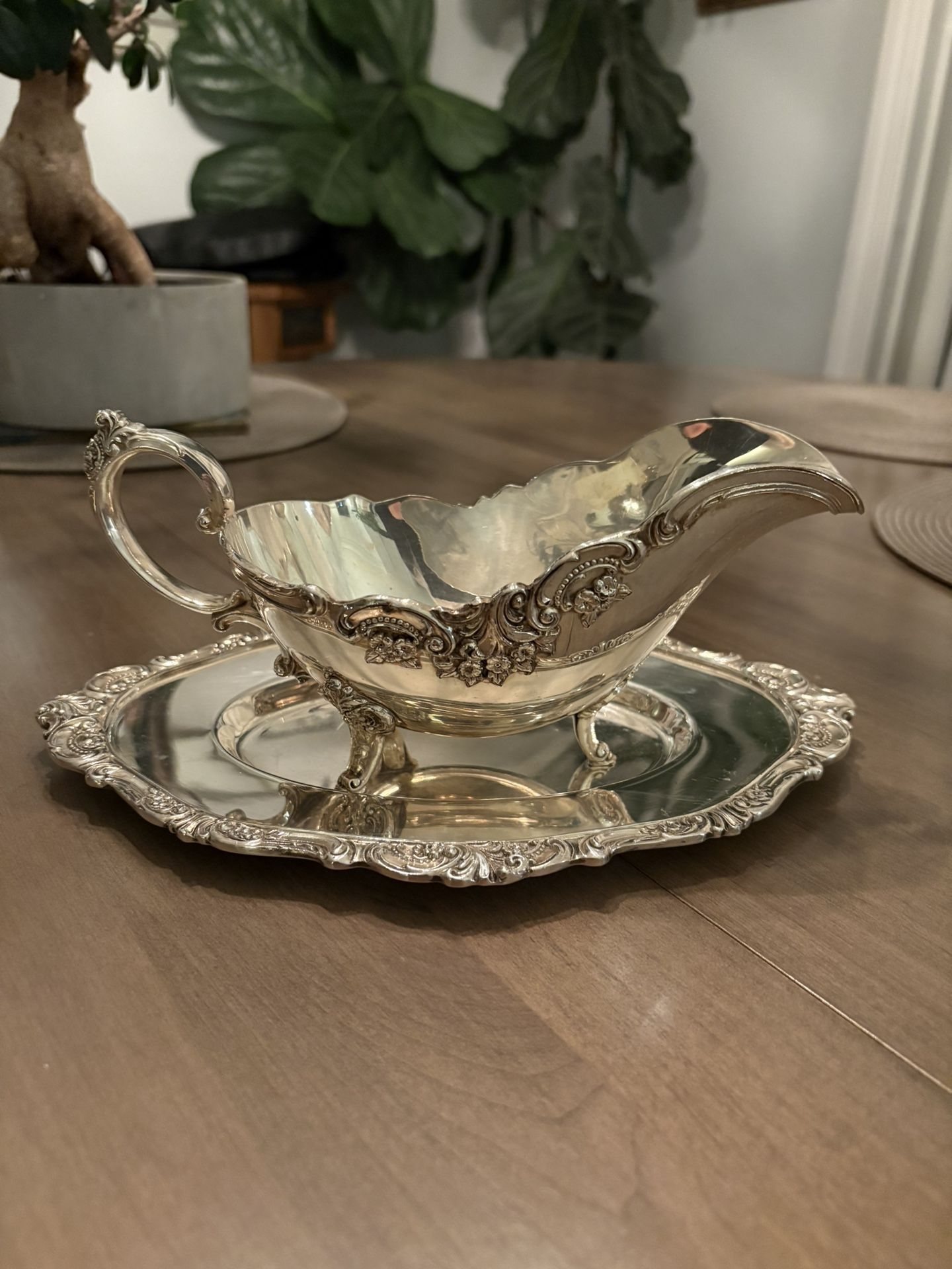 Let this Vintage Wallace Rose Point Silver plate Gravy Boat & Tray dress up your Holiday Table! Cash only. Local Vancouver WA area. Must pick up.