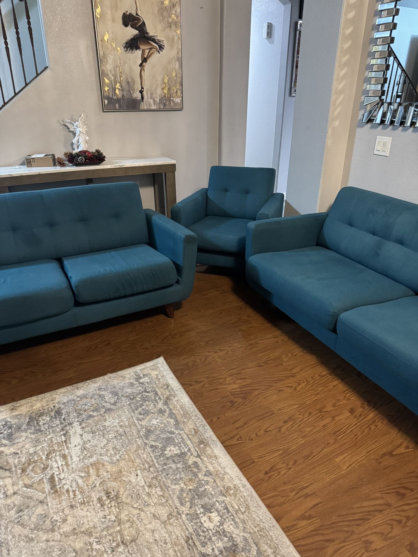 Selling a matching mid-century modern couch set in great condition. Includes 2 loveseats and 1 armchair. Clean fabric, no rips or tears, cushions still firm. From a smoke-free home. Perfect for living room, apartment, or office setup. Pickup only. Message me with any questions.