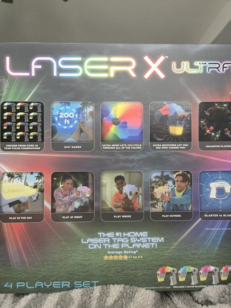 Home Laser Tag System that equips 4 players., Ages 6+. Range: 200 ft; Choose from over 10 team color combinations; Play day or night; Play inside or outside. Includes 4 Ultra Blasters and 12 AAA (1.5V) batteries