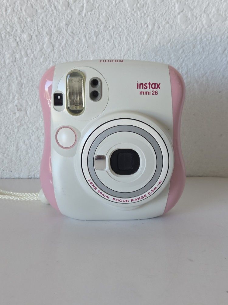 Fujifilm Instax Mini 26 Instant Film Camera - White & Pink. It is fully functional! It works with 2 CR2 batteries, which I will NOT include. I'm always open to a good offer! Acepto cualquier oferta buena! Don't forget to check out my other items. No olvides ver los demas articulos en venta.