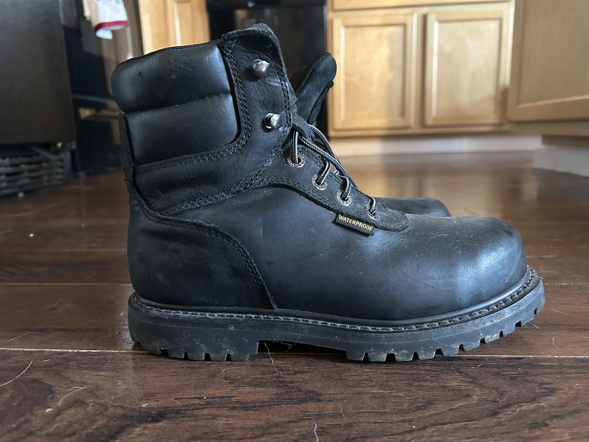 These are the Wolverine Iron Ridge WP Steel Toe Lace Up Work Boots with stock number 08505. The boots are designed for men, with a size 7M in the USA, 6 in the UK, and 40 in the EUR size conversion system. These are very gently used barely worn a few times perfect condition