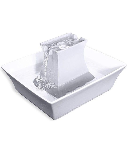 WATER CAPACITY: 2 litre water capacity is great for small to medium sized pets ENCOURAGES HYDRATION: Dual free-falling streams add oxygen for freshness and encourage pets to drink more water FRESH WATER: Includes replaceable carbon water filter that removes bad tastes and odours, keeping water fresh TWO BOWL LEVELS: Upper and lower dish provides two drinking areas for pets; elevated dish is great for senior or arthritic pets HYGIENIC CONSTRUCTION: Ceramic design is more hygienic and looks great in the home EASY CLEANING: Top-shelf dishwasher safe