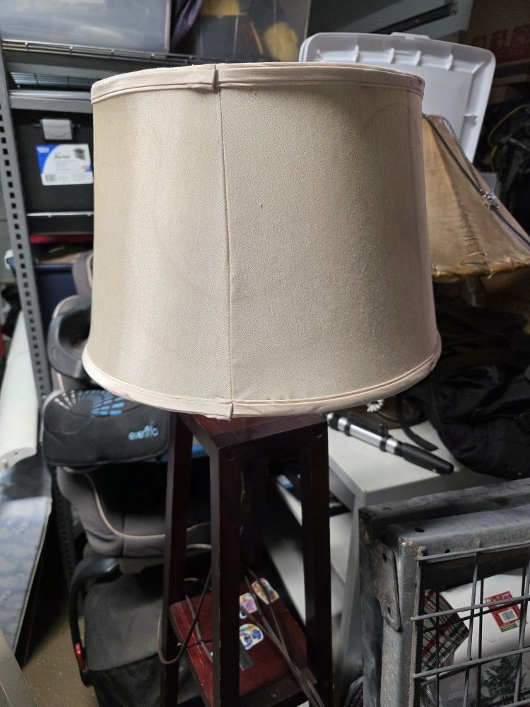 This lamp is made of wood and has three shelving tiers. It was used in my kids room for a long time and he has outgrown it a bit. It's about 5.5 feet tall and doesn't take up much space