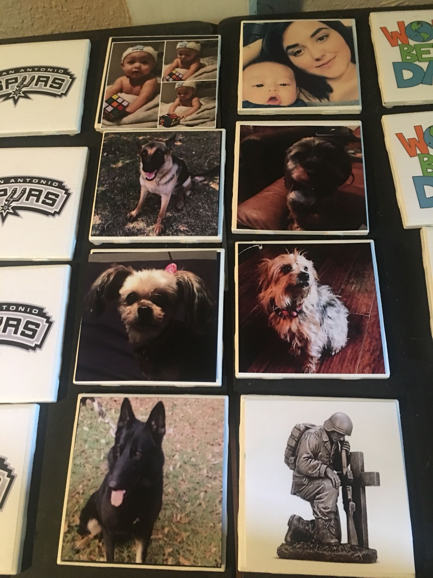 Tile coaster . I can put and team or school , pic of family , pets, 4 for 15$