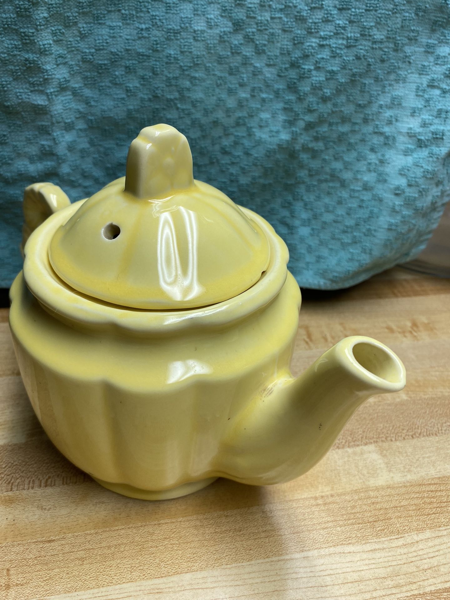 Beautiful Yellow Tea Pot with Lid has a flower on handle.