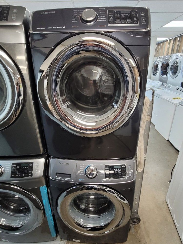 Samsung Front Loading Washer And Stackable Gas Dryer Set In Black Stainless Steel