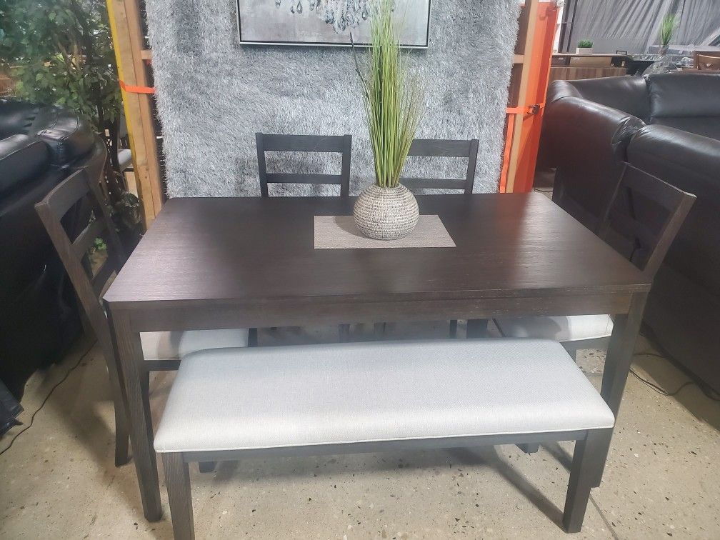 set features a dining table , bench and 4 - side chairs. Table measures 35" x 58" x 30" H. Side chairs measure 17.5" x 20.5" x 37.5" H. Bench measures 48" x 16" x 19.5" H.