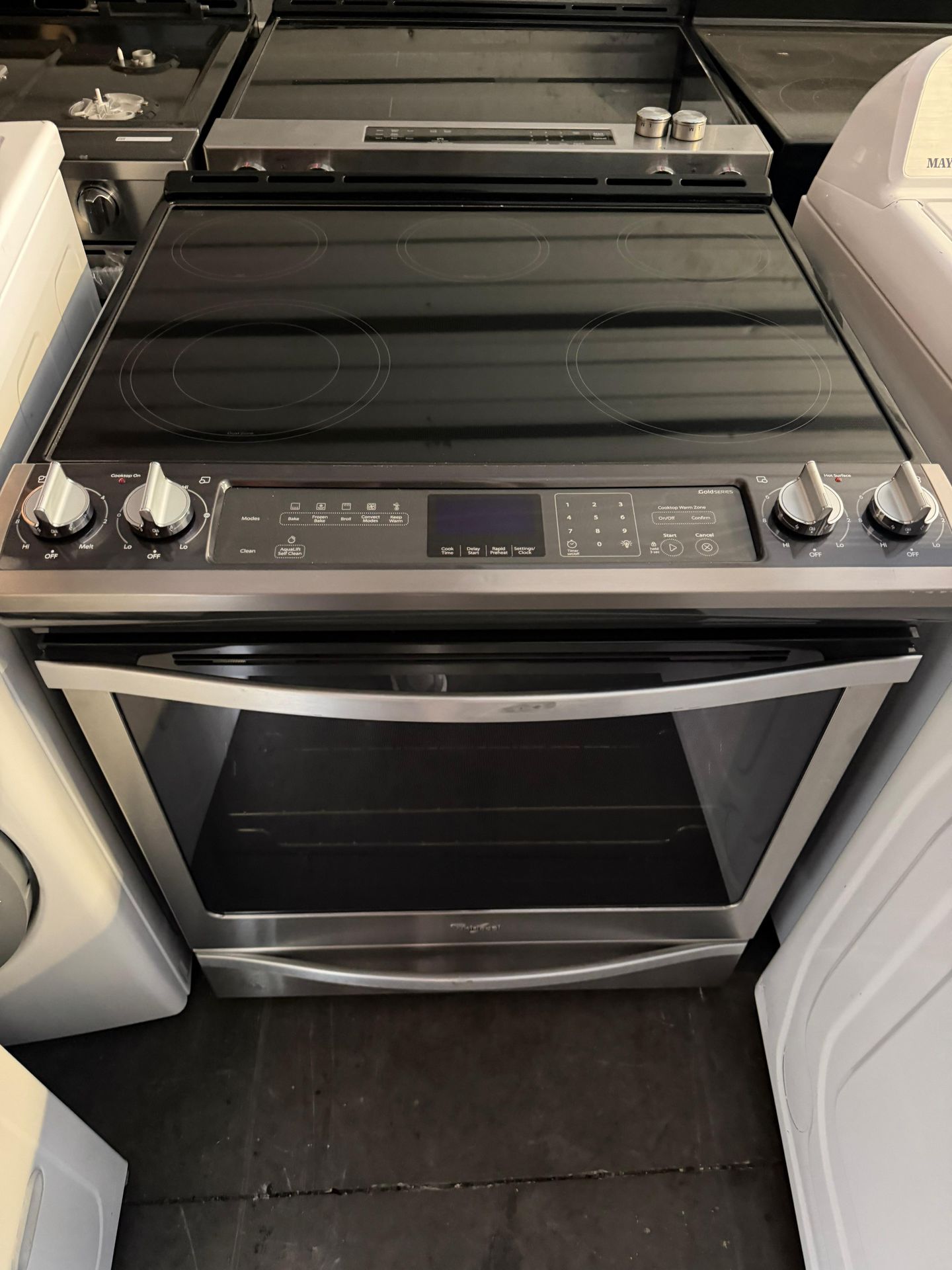 30 Inch Slide-in Smoothtop Electric Range with 5 Radiant Elements, 6.2 cu. ft. Convection Oven, AquaLift Self-Clean, Rapid Preheat, ADA Compliant and Storage Drawer: Stainless Steel Used good condition Working perfect Brand whirlpool Available for pick up Available deliver and installation🚚 30 day warranty ✅