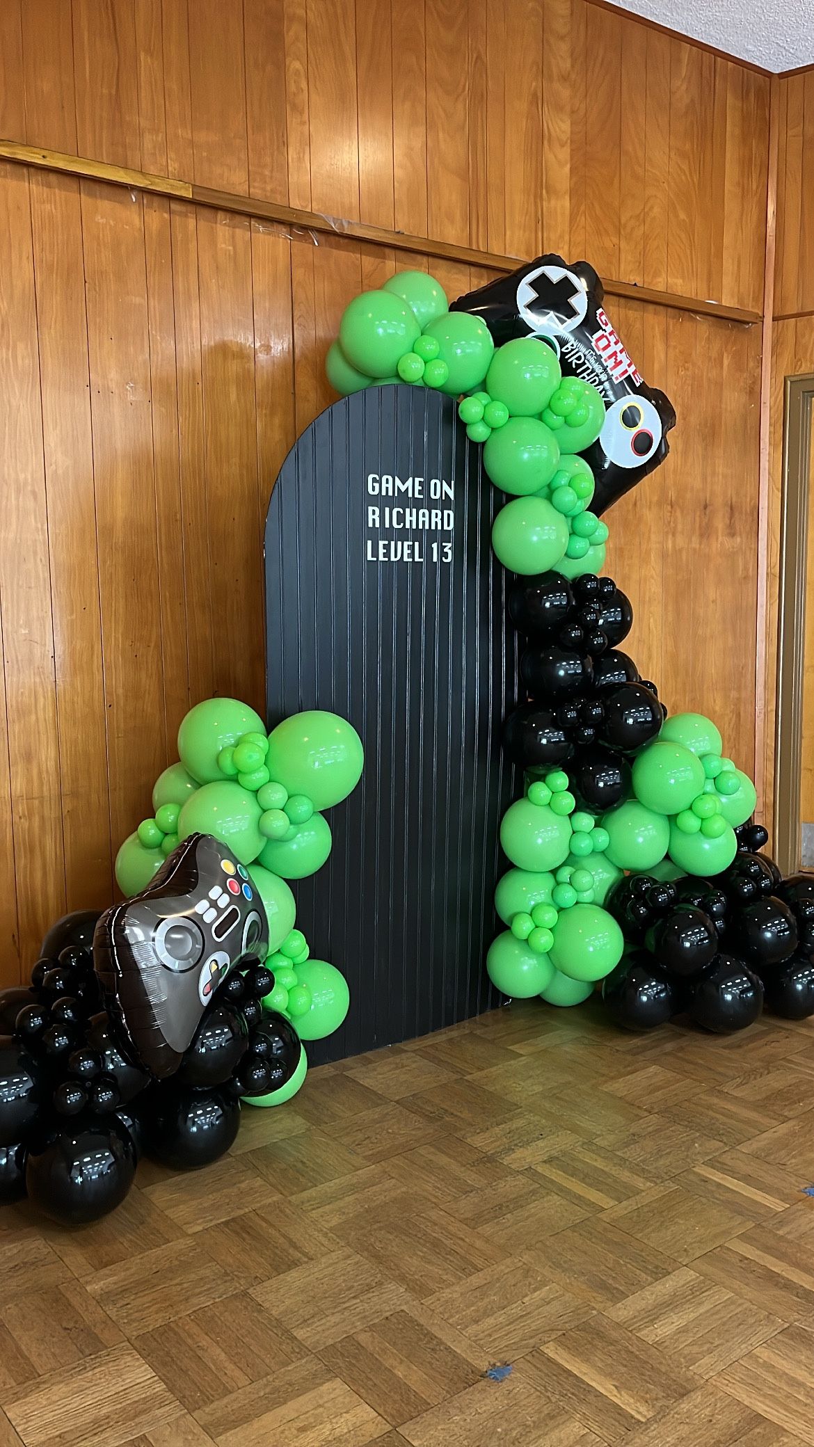 Game on balloon garland decor -balloons -black backdrop