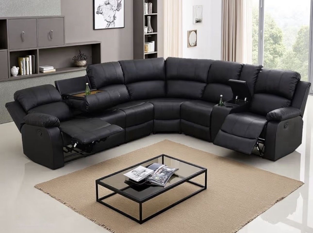 Black Leather Fully Reclining Sectional Couch And Ottoman