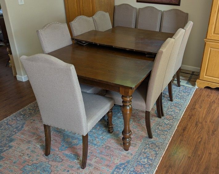 6 seater dining table set, shows signs of use/wear and tear (some examples shown in photos - bubble in table & fabric stain in 2 chairs) What's included/ Dimensions - *Dining table (standard height, real wood/heavy) - 44" wide × 72" long + 18" leaf (Overall length: 90") **6 Fabric seats** Note: **Photos show 10 chairs, but 4 were sold separately. ** Items remaining: 6 chairs and table w leaf. Table legs have been disassembled, leaf is detached, and are ready to be loaded and hauled away. Pickup from the Maple Valley. Can help loading, but CANNOT deliver. Will consider a reasonable offer. Accept cash/Venmo.