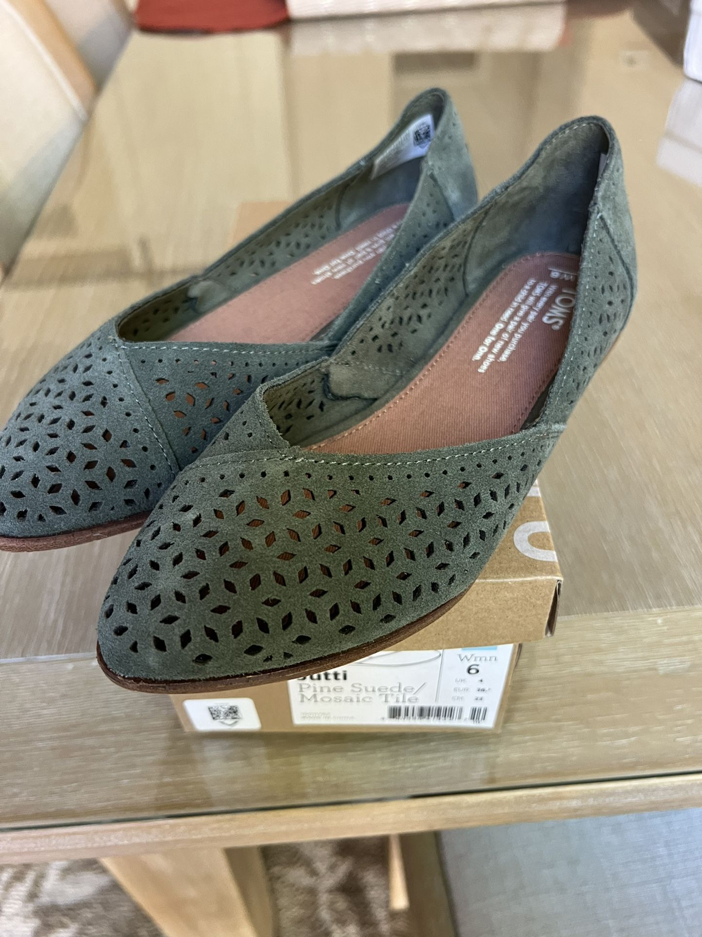 TOMS Jutti Pine Suede/Mosaic Tile Flats. Laser cut details, suede upper. New in box.
