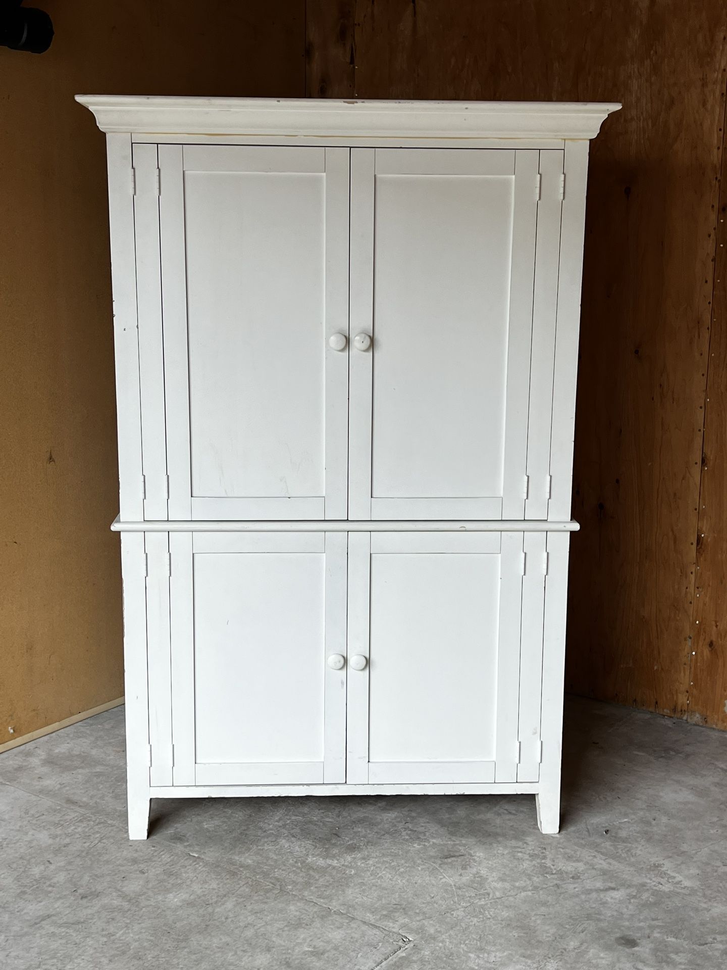 Fully functional armoire desk. It has some scratches, wear and glue yellowing at the joints but is otherwise in good shape. Fits a 32” monitor and have previously used it with a Humanscale M8 Adjustable Articulating Monitor Arm (Bolt Through Mount with Base) Need to sell as it won’t fit in our current home, but otherwise loved this piece.