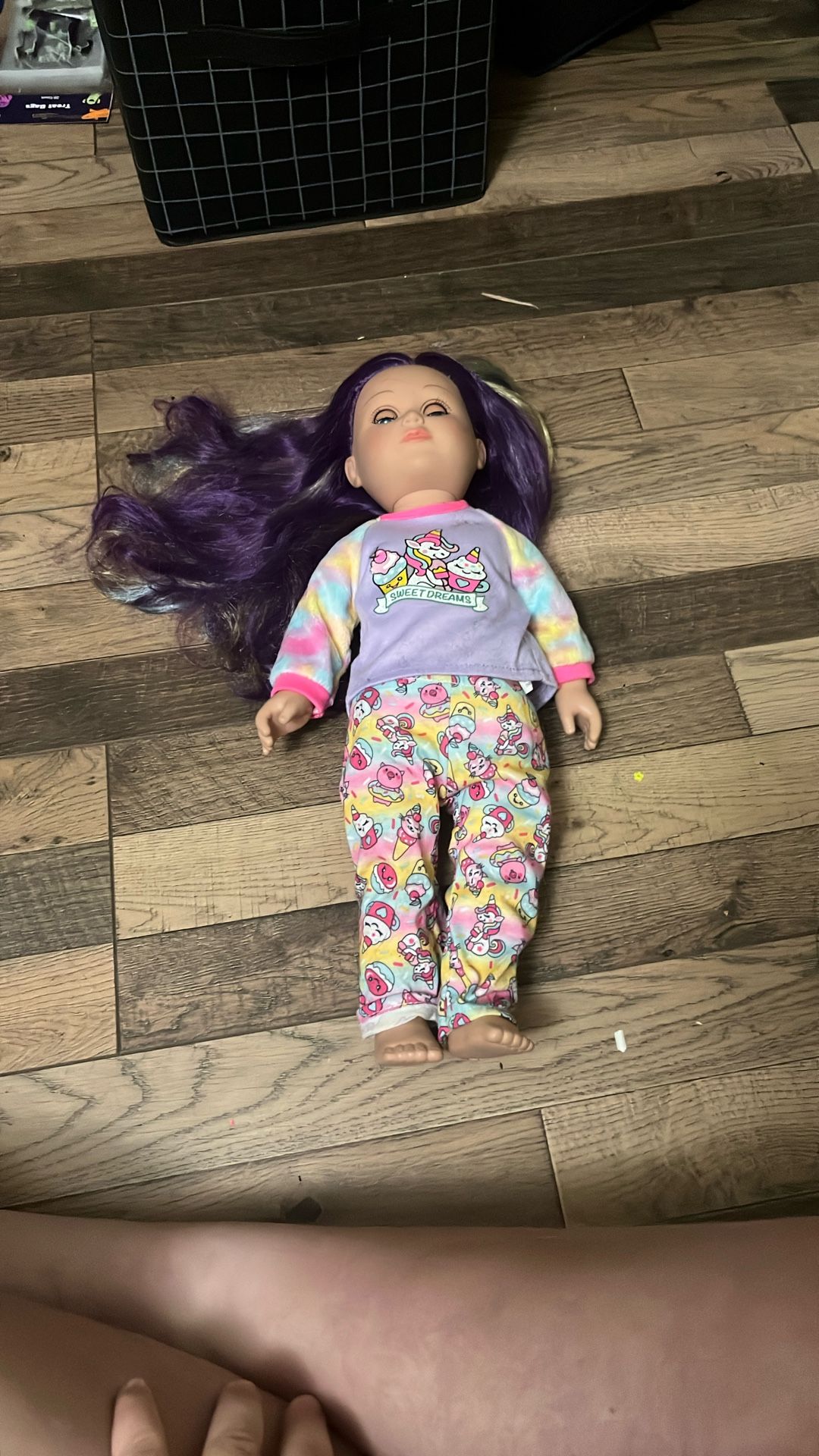 This American girl doll has purple hair with some colored hair, the colors are yellow and blue, she is in pajamas and she is well functional and is practically new