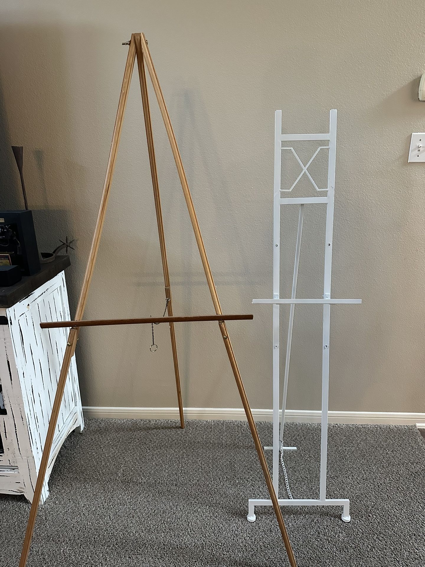 Metal Easel, 16" x 19" x 57", White Wood easel, approximately 67 “ tall