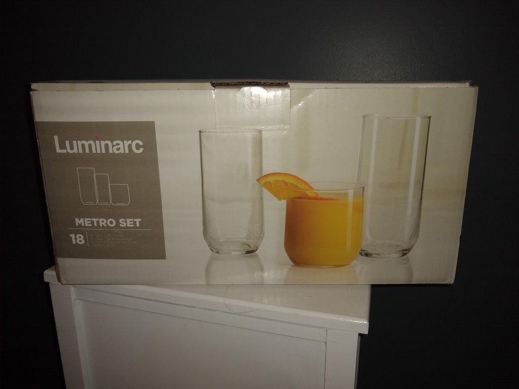 Glasses set, new in box. 18 piece, 3 sizes. Pick up in NE Gresham, off of 167th and Glisan.
