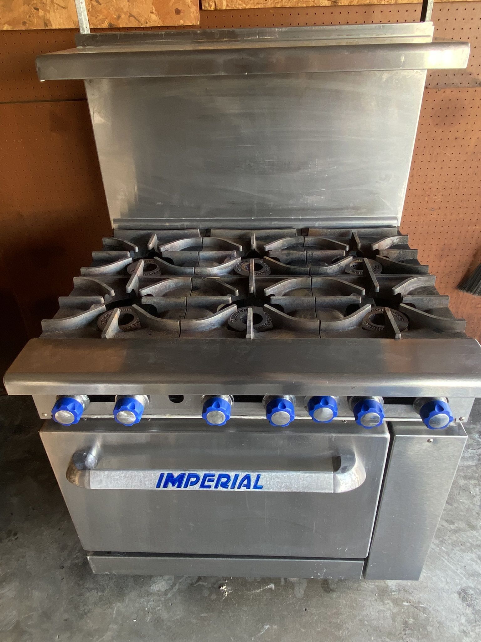 Working Good Delivery is available Standard Features The Imperial IR-6 gas range has six anti-clogging burners that separate with no gaskets or screws to ease cleaning, and each burner has its own standing pilot, so users can light as many as needed. So pots can slide from section to section, the cast iron grates are extra wide. To reduce cook times, the back grates are intended to place large stock pots directly over the burner, and this unit includes a removable crumb tray and a large landing ledge for extra work space. Easing maintenance, the unit's exterior is made of stainless steel, while its oven has a porcelain interior that prevents food from getting stuck inside and speeds up the cleaning process. Its unique burner baffle evenly distributes heat, and the oven provides 35,000 BTU of heating power. The unit comes with one chrome oven rack and accommodates 18-inch by 26-inch pans. Specifications Front grates: 12 in. W x 11 in. D Back grates: 12 in. W x 13 in. D Oven interior: 26.5 in. W x 26 in. D x 14 in H Overall: 36 in. W x 31.5 in. D x 56.5 in. H Heated by natural ⛽️