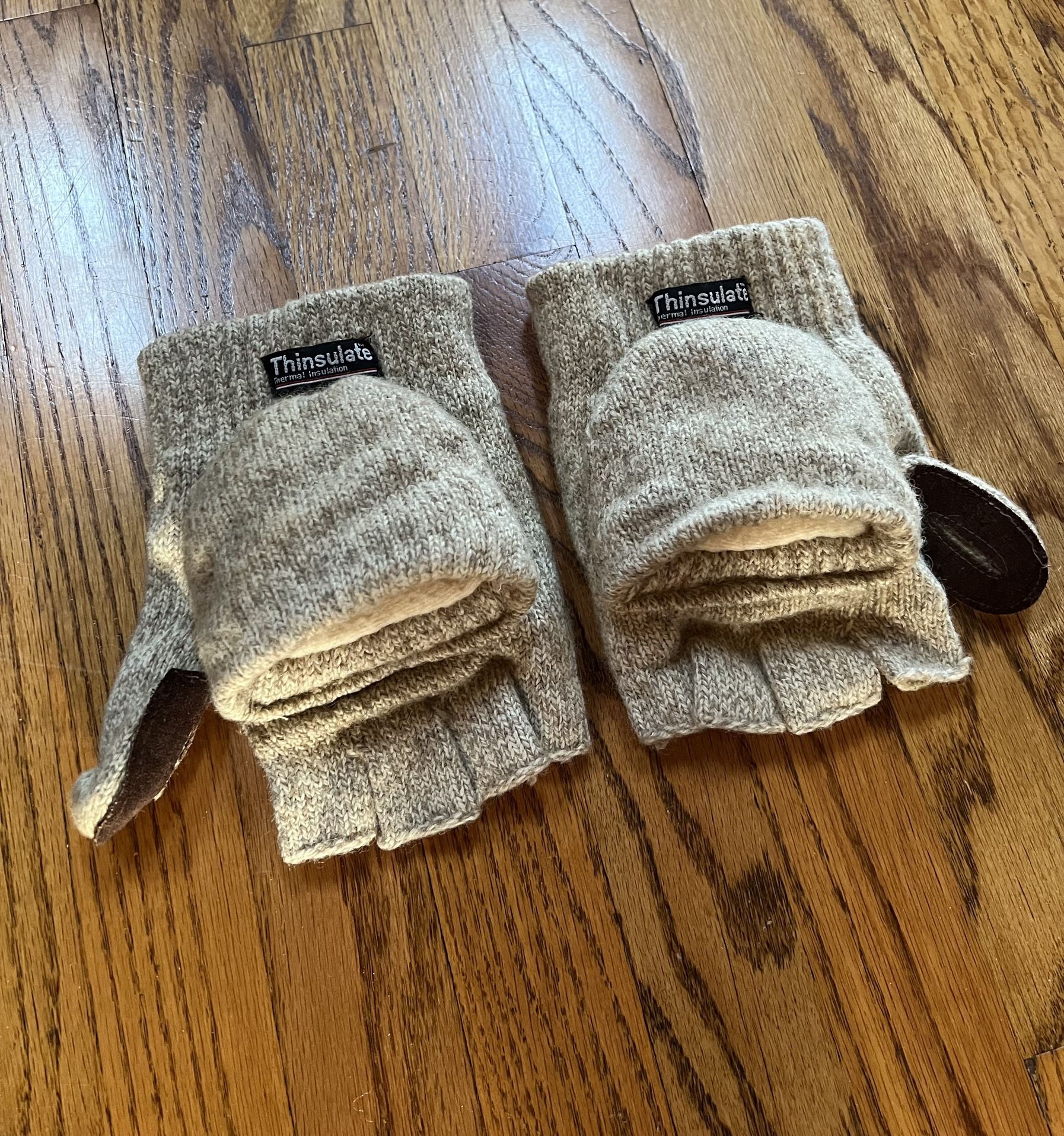 Thinsulate Insulated Ragg Wool Convertible, Pop Top Mitten Fingerless Gloves with Suede Palm to keep your hands toasty warm. MATERIAL & WARMTH: 15% nylon / 85% ragg wool outer shell, one of the warmest natural materials on earth. Wool also provides wicking, to help keep your hands dry. CONVERTIBLE MITT DESIGN: This is a superbly warm convertible mitt option when you absolutely need to stay warm but also need the flexibility to pull back the hood and use your fingers to handle tools or grab smaller objects. Mittens keep your fingers warmer with natural body heat. Keep dexterity by removing mitt top and converting to open-finger glove. ADDITIONAL FEATURES: Pull-back hood that allows you to also use as a fingerless glove when you need more dexterity; Enjoy enhanced grip and durability with a reinforced suede leather palm patch. Cash only- will not ship or deliver. Can meet in the Naperville/Aurora area.